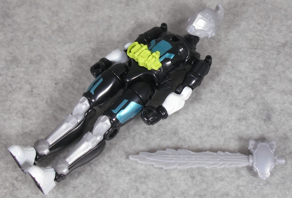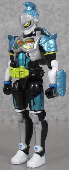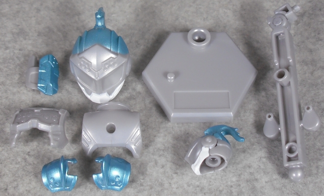 頭、胸、背中、肩アーマー、左腕のシールド周り、腕裏、脛が銀成型、それ以外は黒成型。