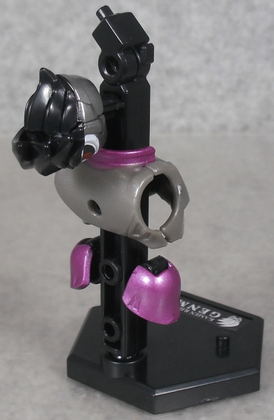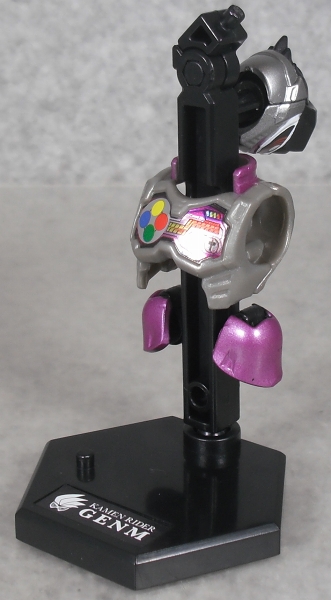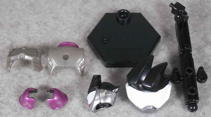 頭部のピンクと白と銀、襟のピンク、腹部と腿の紫のライン、肩アーマーのピンク、バックル、腿の紫のライン、足の紫が塗装済み。